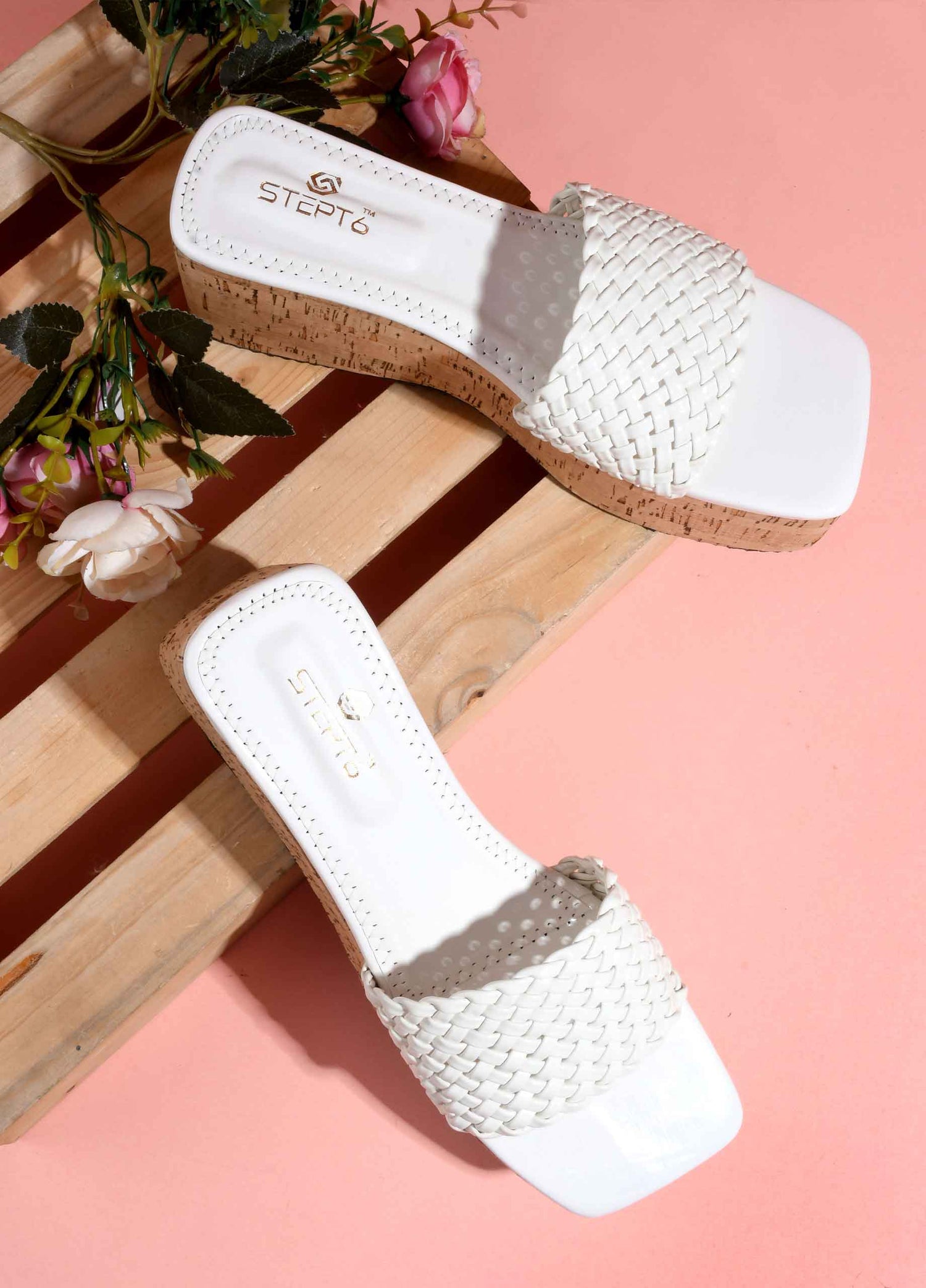 WHITE BLACK ZIG ZAG STRAP BLOCK HEEL