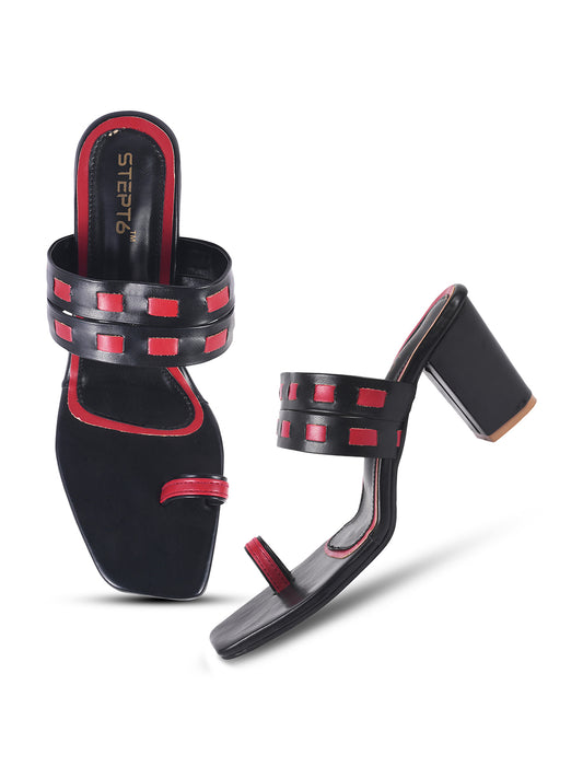 BLACK RED ZIG ZAG STRAP BLOCK HEEL