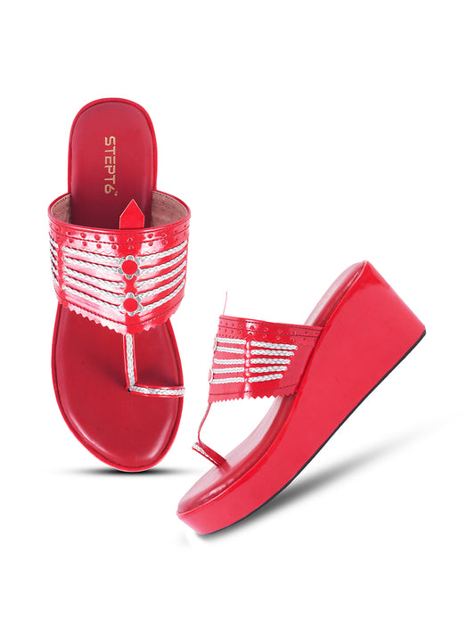 RED WOVEN SLIVER STRINGS KOHLAPURI WEDGES