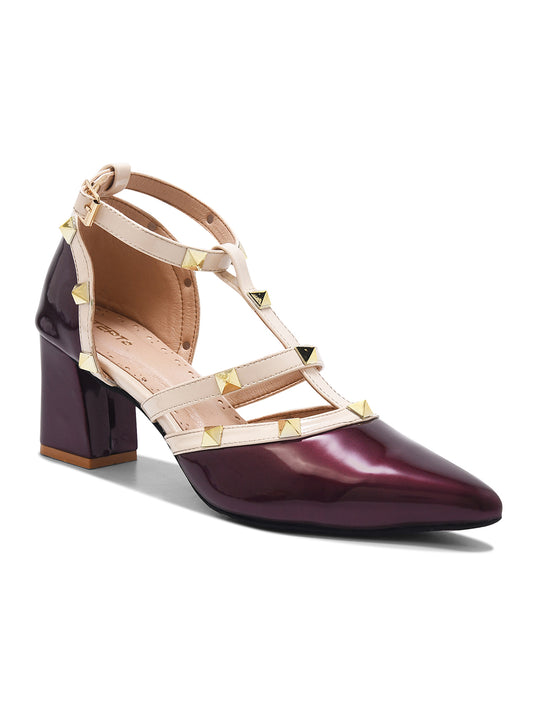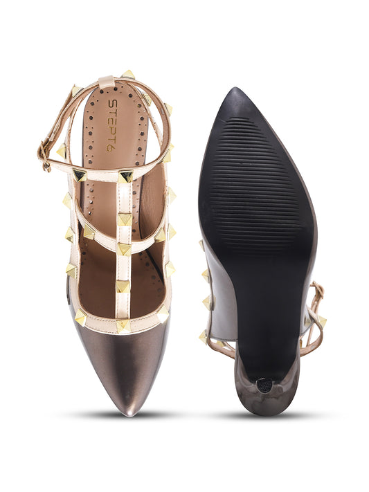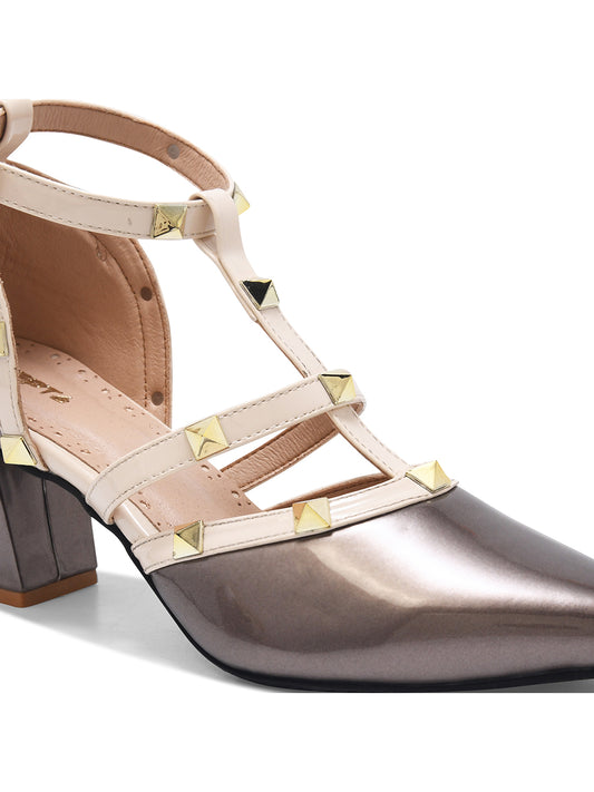 Metallic Grey Studded Strap Block Heel Pumps for Women